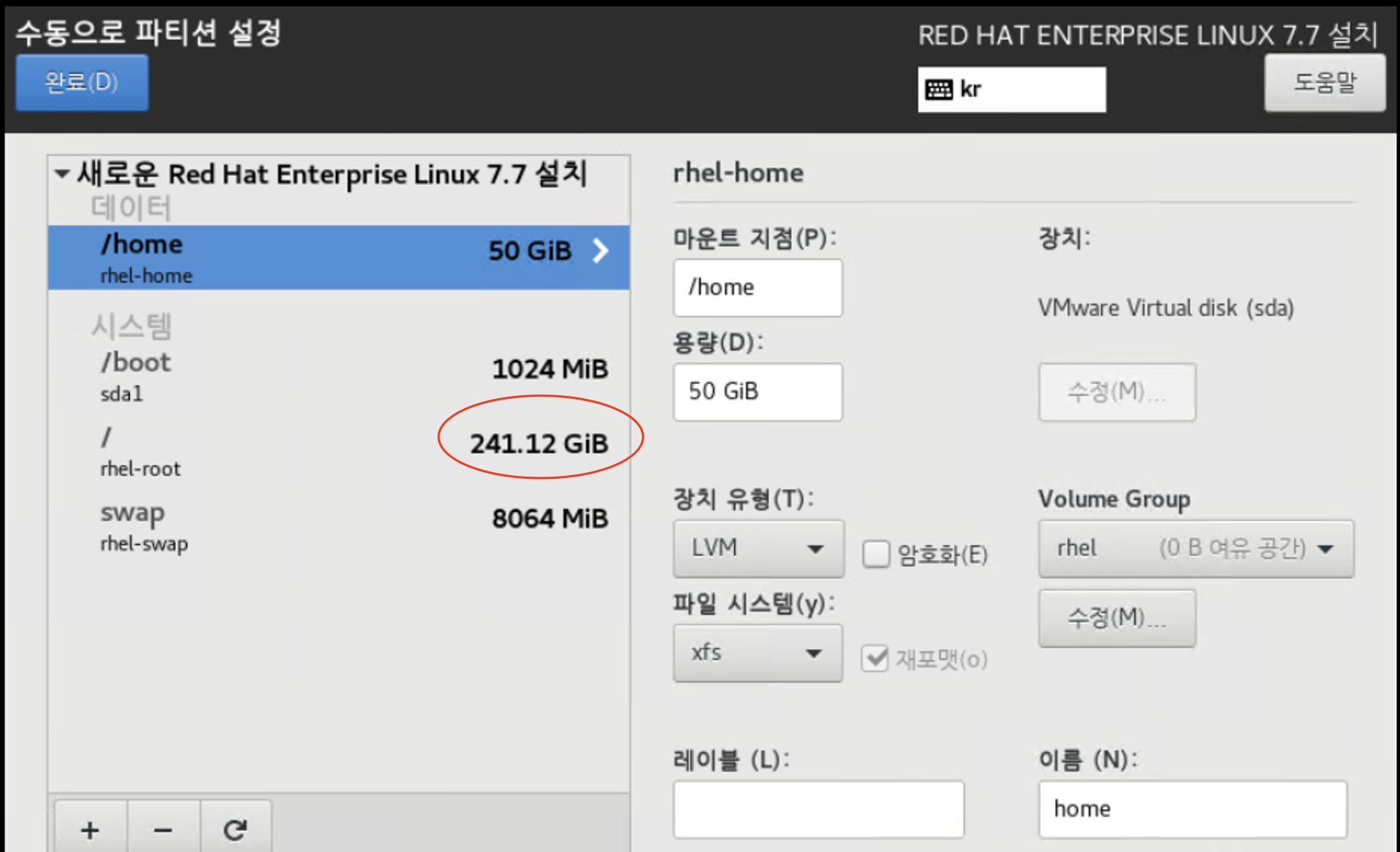 이 매뉴얼에서는 Root(/)밑에 많이 할당하도록 변경하겠습니다.