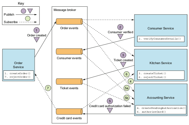- 아래 예에서 4번 step의 authorizeCreditCard()가 pivot transaction입니다. createOrder(), verifyConsumerDetails(), createTicket()는 compensatable transaction입니다. authorizeCreditCard()가 실패하면 보상transactioin인 rejectTicket()과 rejectOrder()가 수행되어 rollback처리를 합니다. approveTicket()과 approveOrder()는 retriable transaction이고 일시적 장애가 나도 이벤트메시지를 읽어 성공할때까지 재시도합니다.