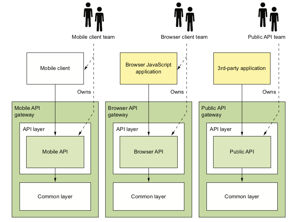 Netflix모델은 API Layer는 각 Client team에서 담당하고, API Gateway팀(별도구성 필요)은 Common layer와 운영을 담당하는것입니다.