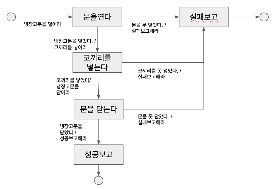 | 냉장고 문을 닫아라 | 문을 닫는다 | 문 상태 변경: 닫힘/못 닫힘 | 냉장고 문이 닫혔다. |
