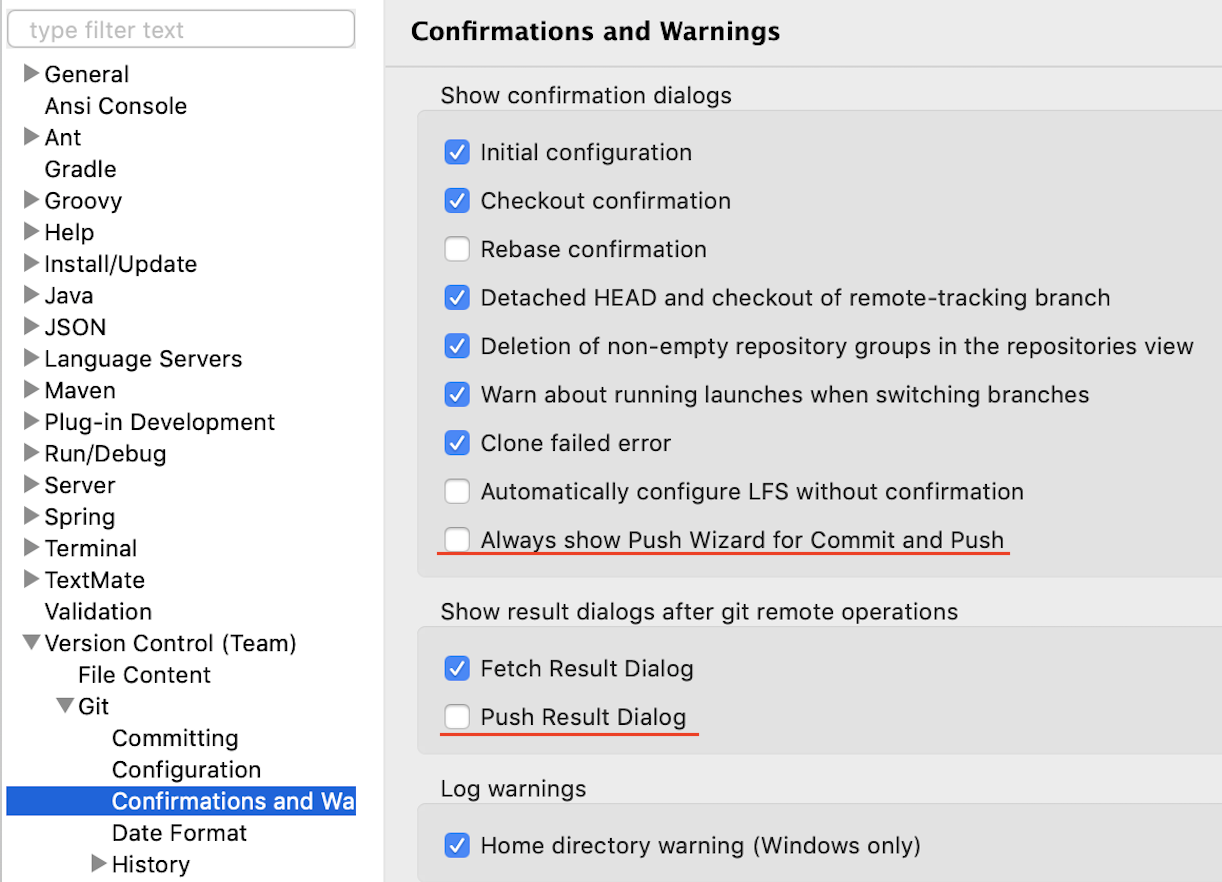 push할때 자꾸 확인창이 나와 불편할겁니다. 아래와 같이 Preference에서 옵션을 변경하십시오.