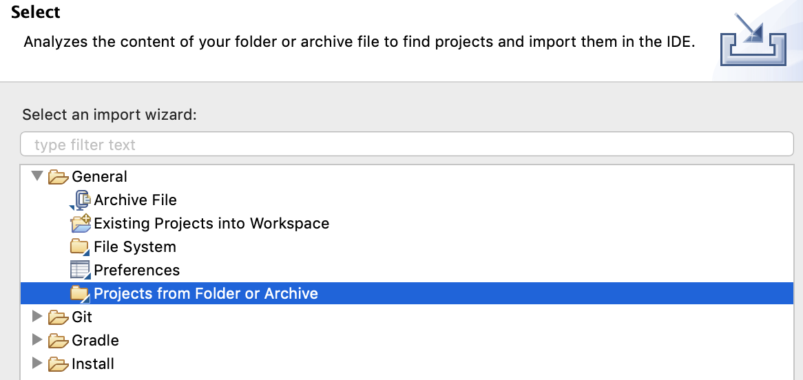 - 우측 마우스 메뉴에서 'Import'선택 후 General > Projects from Folder or Archive선택