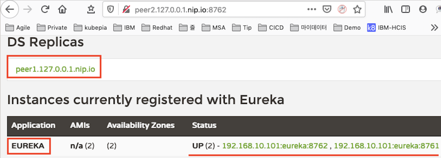 아래와 같이 DS Replicas에 peer2.127.0.0.1.nip.io가 나오고, 'EUREKA'로 Application이 등록되어 있으면 성공입니다.