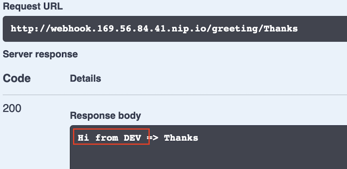 - configmng의 webhook/webhook-dev.yaml 파일에서 greeting값을 변경하고 push