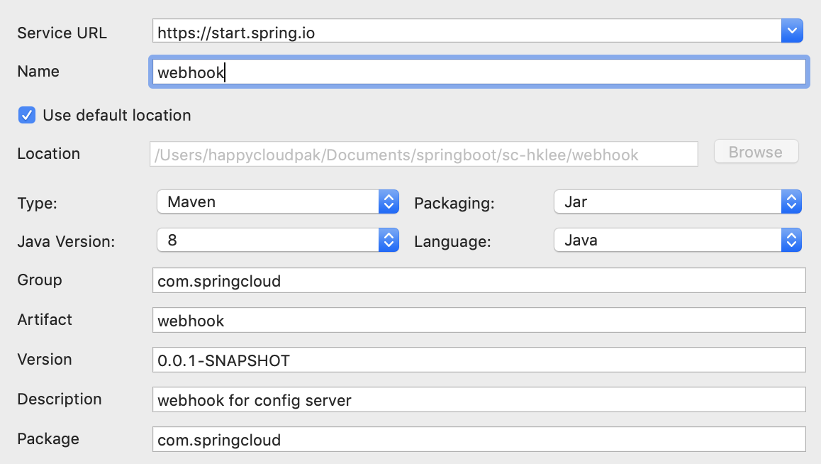 github에서 config server로 직접 POST하면 에러가 발생하기 때문에, 저는 이 처리를 담당할 webhook이라는 어플리케이션을 제작하여 사용할것입니다.
