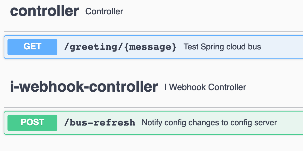 이 어플리케이션에는 config server에 변경 통지를 하는 API뿐 아니라, Spring cloud bus를 테스트 하기 위한 API도 추가하도록 하겠습니다.