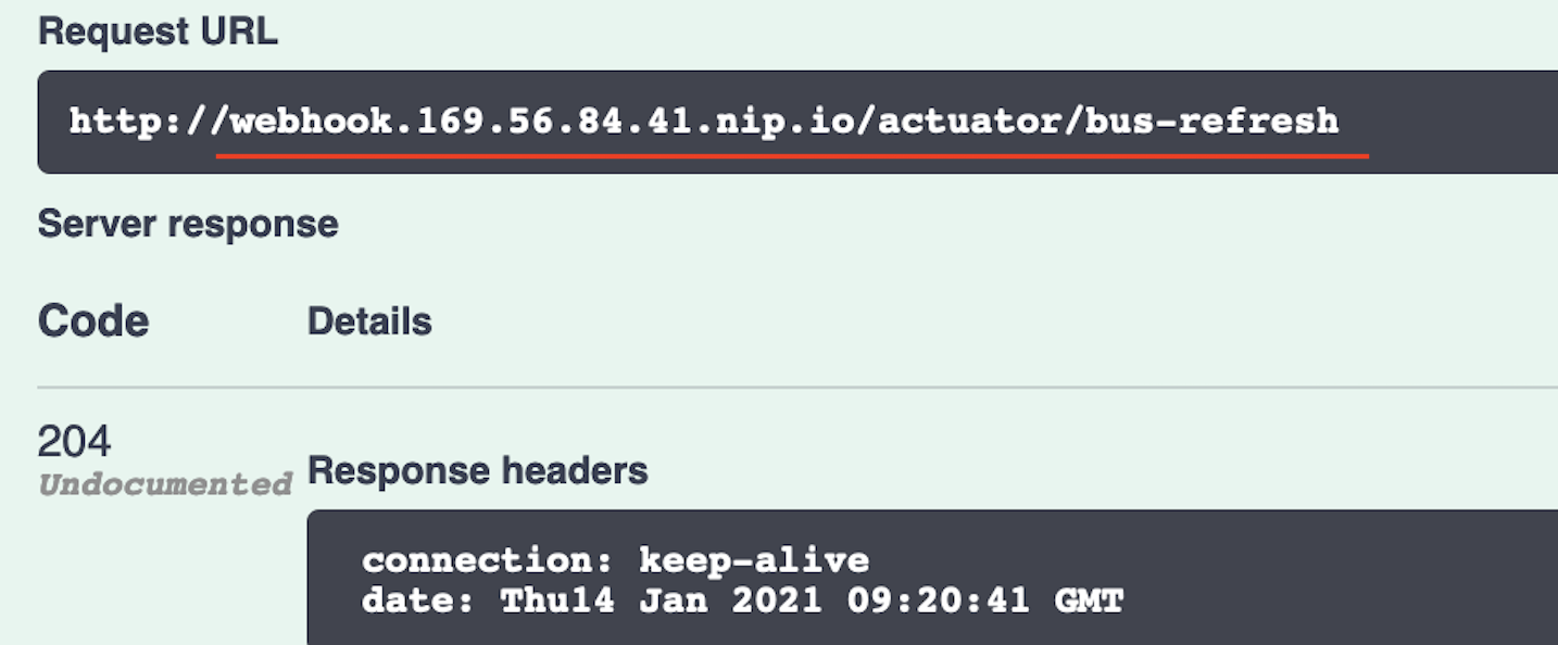 그래서 github에서는 별도로 개발한 http://{webhook host}/bus-refresh를 호출하고, webhook 앱이 http://{config server host}/actuator/bus-refresh을 호출하도록 했습니다.
