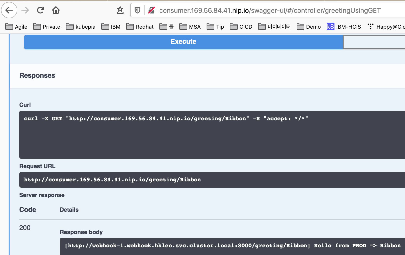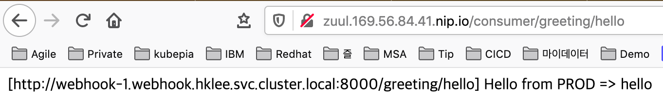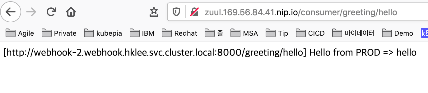 모든 Pod가 실행되는걸 기다렸다가 zuul을 통해 consumer로 연결되고, consumer에서 ribbon을 이용하여 webhook으로 연결되는지 확인합니다.