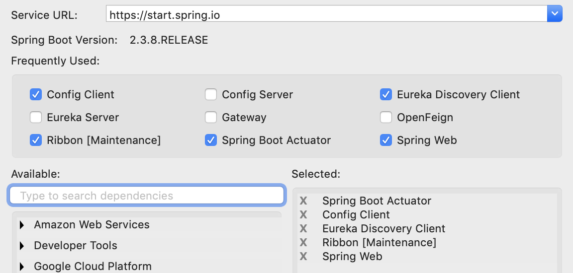 - eureka.enabled: eureka를 사용하여 연결할 backend service를 찾음. 이 값을 false로 하면 ribbon.listOfServers에 콤마로 구분하여 backend service의 주소를 지정해야 함.