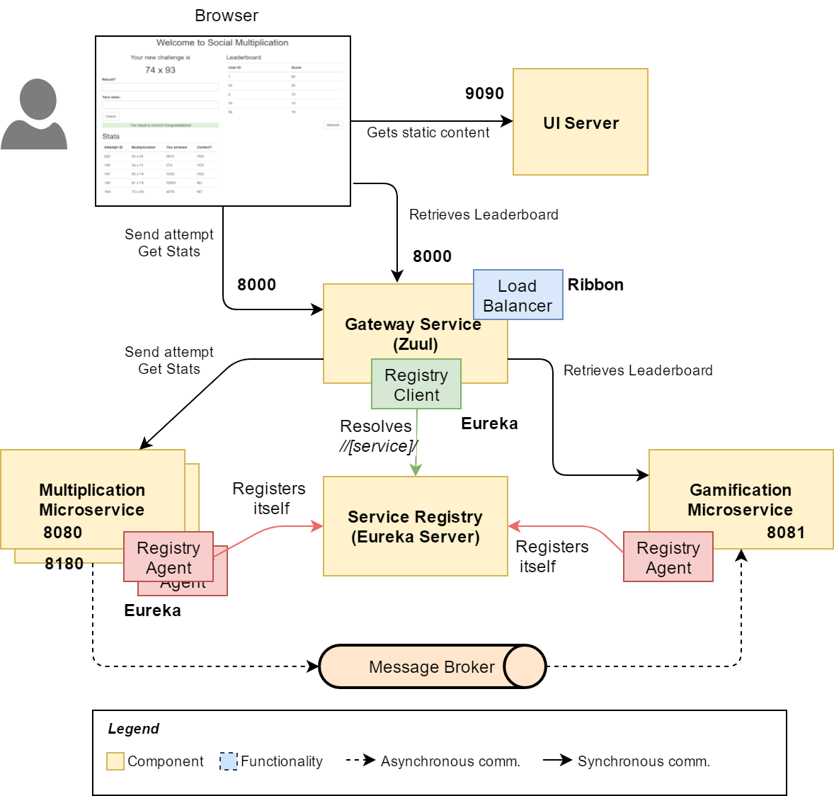 Spring cloud framework을 이용하면 보통 Load balancer는 API Gateway내에 embed됩니다.