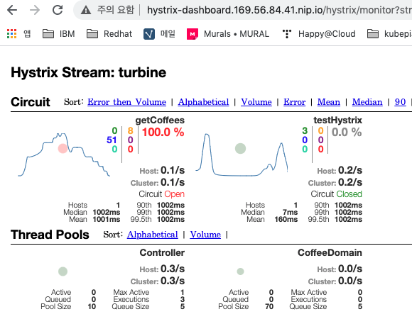 1번 이상 느린 응답이 오면 아래와 같이 circuit breaker가 열립니다. 콘솔과 hystrix dashboard에서 확인할 수 있습니다.