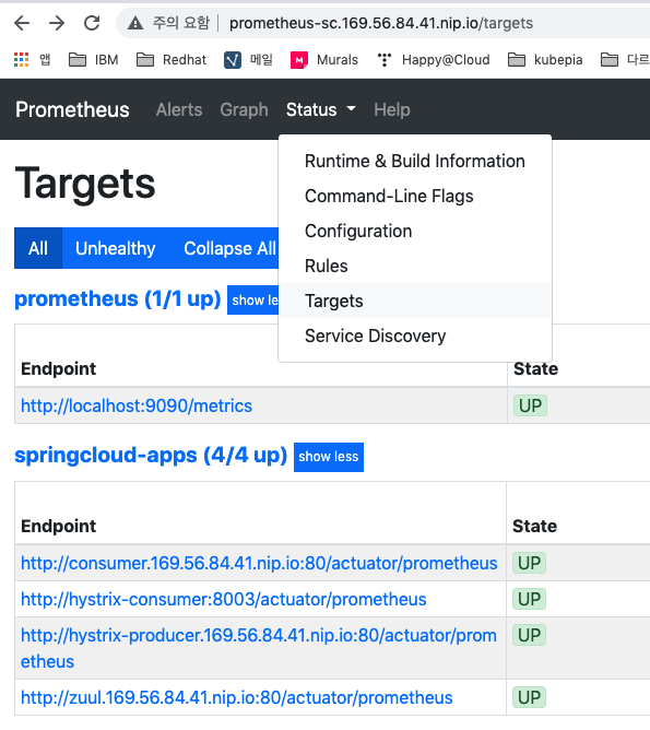 prometheus-sc의 ingress주소를 열고, Status > Targets를 클릭하여 대상 어플리케이션의 상태가 모두 'UP'인지 확인합니다.