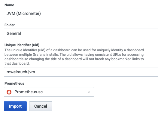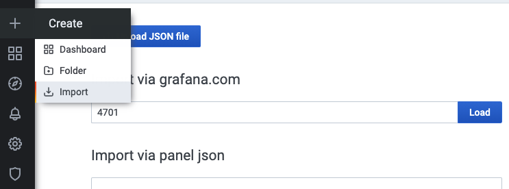 Create > Import를 누른 후, import할 dashboard id를 붙여넣습니다.