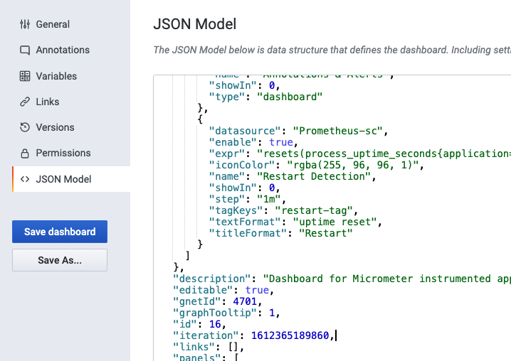 특히 환경설정에서 [JSON Model]을 클릭하면, json으로 대시보드의 소스를 볼 수 있습니다.