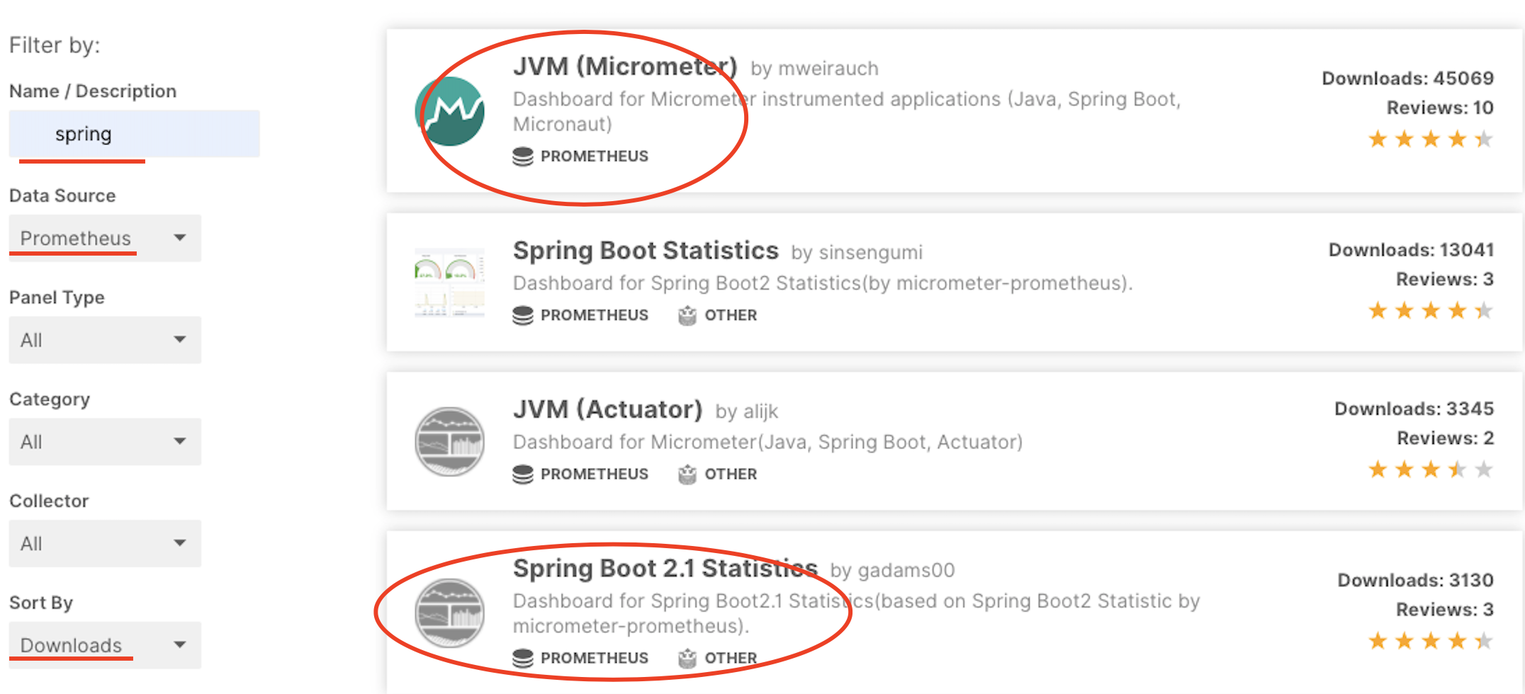 grafana.com 사이트에서 아래와 같이 검색하여 import할 대시보드를 선택합니다.