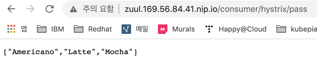 http://{zuul ingress host}/consumer/hystrix/{param}을 실행하면 위 순서대로 호출되어, 주문 가능한 커피목록을 리턴합니다.