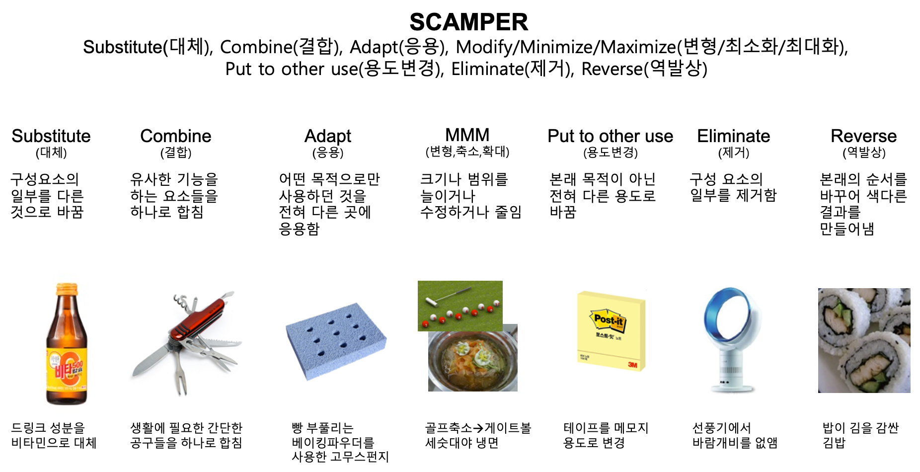 대표적인 아이디어 발상 기법인 SCAMPER를 1장으로 요약해 봤습니다.