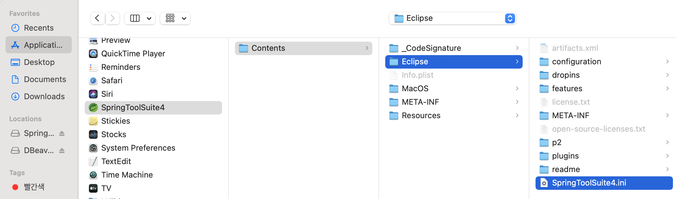 Mac은 아래와 같이 Applications에서 SpringToolSuite4를 찾아, SpringToolSuite4.ini를 선택하시면 됩니다.