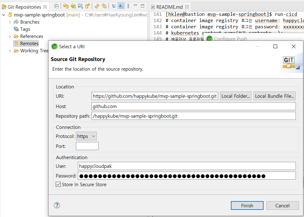 - Remotes에 있는 기존 origin은 제거하고, 다시 추가 합니다. 이때 암호는 Token값을 넣습니다.