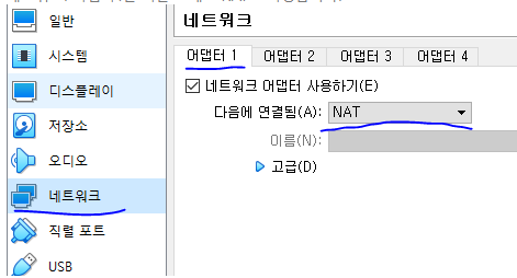 - 네트워크 어댑터 1(NAT)를 위한 설정파일을 변경