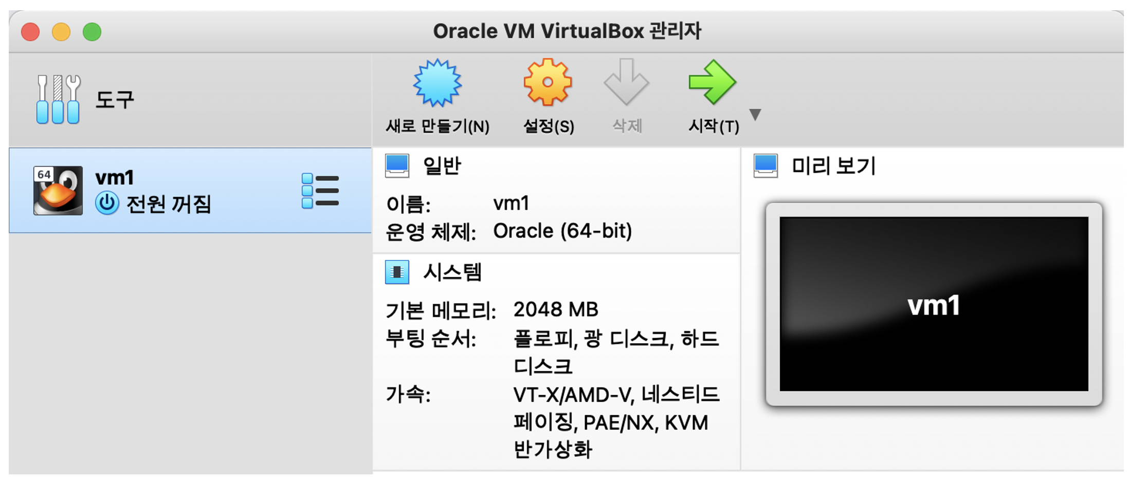 VM을 선택하고, 우측 상단의 '시작'버튼을 클릭하여 실행합니다.