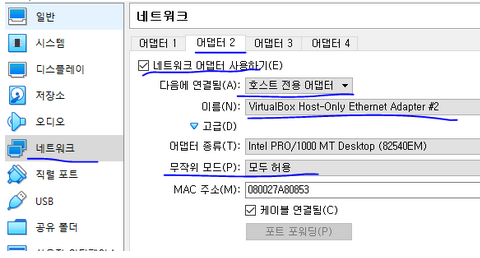- 네트워크 어댑터 2(호스트전용)