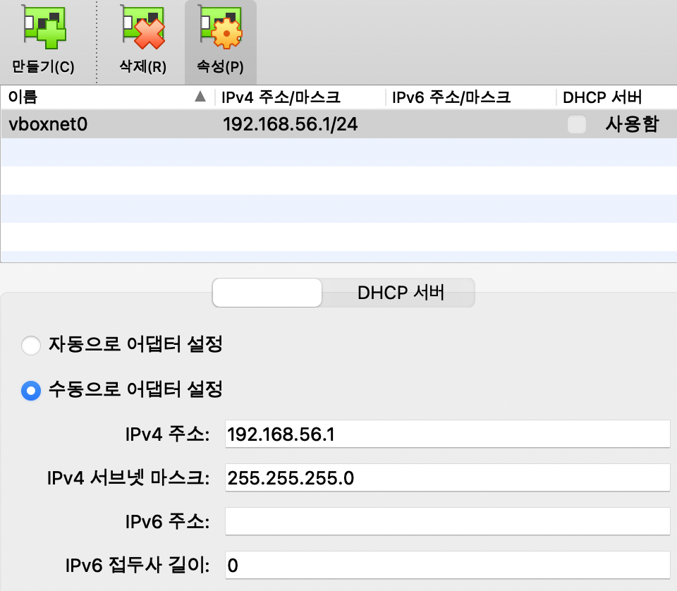 먼저, Network Connection을 추가합니다. 이때 IP는 VirtualBox Host전용 어댑터의 IP보다 크면 됩니다.