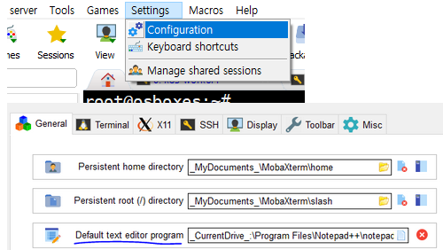 | MobaXTerm 설정 | Host PC에서 MobaXTerm을 실행하십시오. Mac사용자는 터미널을 열고 'ssh root@{VM IP}'명령을 실행하고, 변경한 root암호로 로그인하시면 됩니다. 기본 에디터 지정 MobaXTerm에서 PC의 에디터를 지정하면, vi를 사용하지 않고 익숙한 에디터로 사용할 수 있습니다. ![]() Terminal의 폰트종류와 크기를 지정합니다. ![]() |