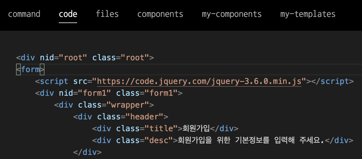jQuery와 같은 외부 라이브러리를 추가하려면 아래와 같이 DIV "root" 하위에 아래 예제와 같이 추가합니다.