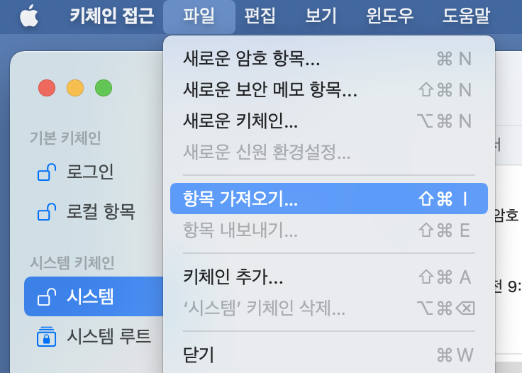 '파일 > 항목 가져오기'를 선택합니다.