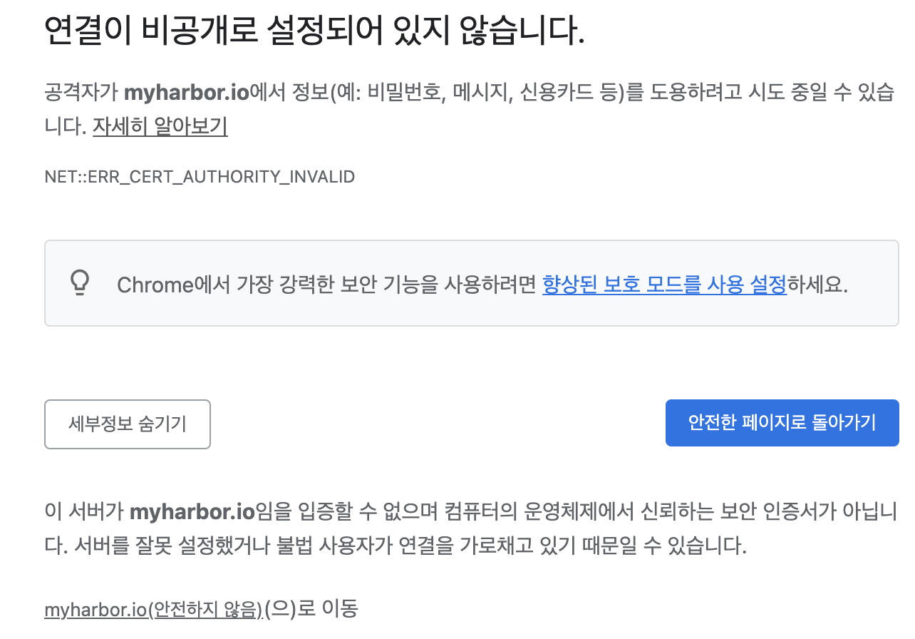 SSL인증서를 이용하여 웹 서버를 구성한 후 웹브라우저에서 접근하면, 아래와 같이 경고 페이지가 나타납니다.