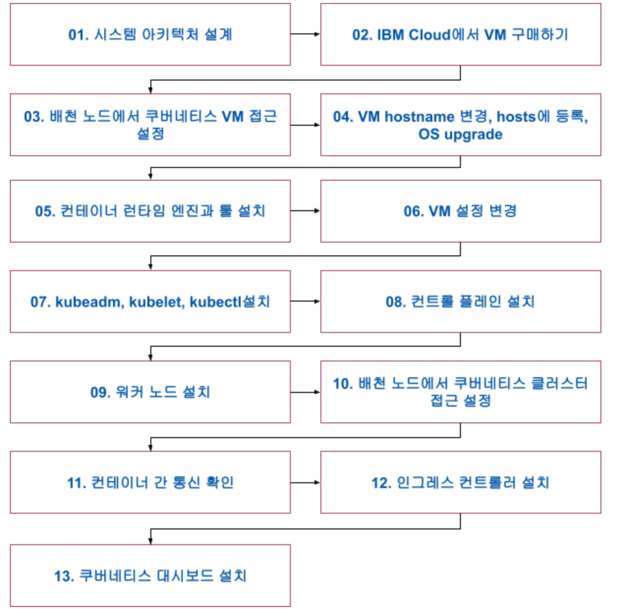 ========= CRI-O 기반 Kubernetes 1.23.X 설치 ========== 목차 01. 시스템 아키텍처 02. IBM Cloud에서 VM 구매하기 03. 배천 노드에서 쿠버네티스 VM 접근 설정 04. VM hostname 변경, hosts에 등록, OS upgrade..