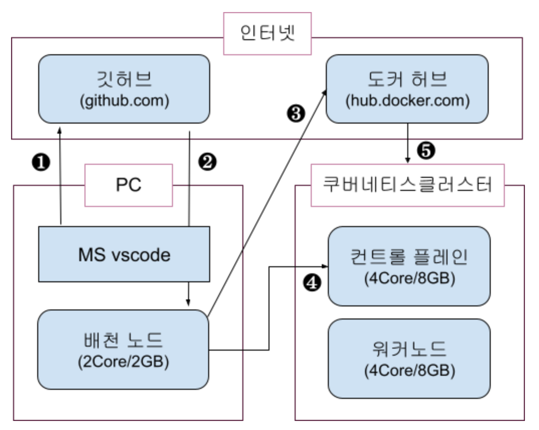 위 아키텍처 그림에 어플리케이션을 쿠버네티스 클러스터에 컨테이너로 배포하는 절차를 단순화하여 표시하였습니다.