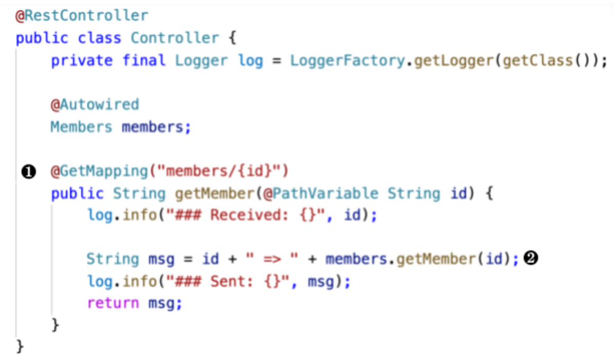 member 어플리케이션의 src > main > java/com/ott/member > Controller.java를 보시면 ❶ ‘/members/{id}’로 요청 받으면 ❷ members.getMember(id)를 호출하여 그 결과를 리턴하는 것을 알 수 있습니다.