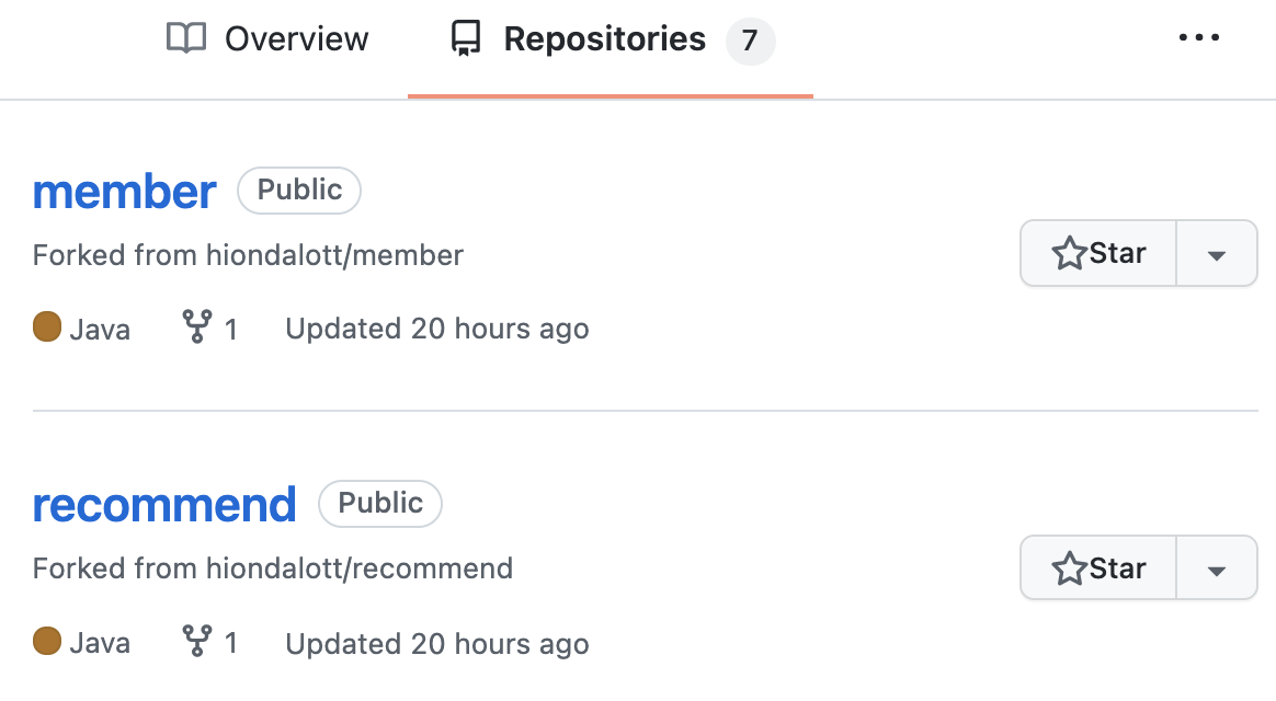 | ~/k8s/ott ❯ git clone https://github.com/hiondal/member.git 'member'에 복제합니다... … ~/k8s/ott ❯ git clone https://github.com/hiondal/recommend.git 'recommend'에 복제합니다... … |