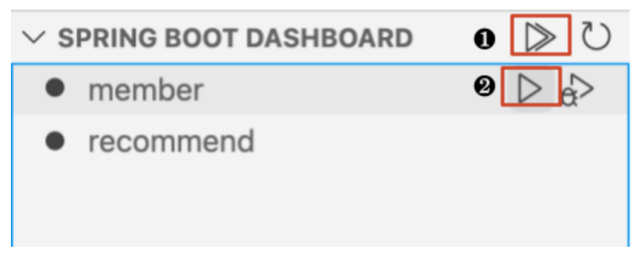 ‘SPRING BOOT DASHBOARD’에서 ❶ 두 어플리케이션을 한꺼번에 실행하거나, ❷ 하나씩 실행할 수 있습니다.