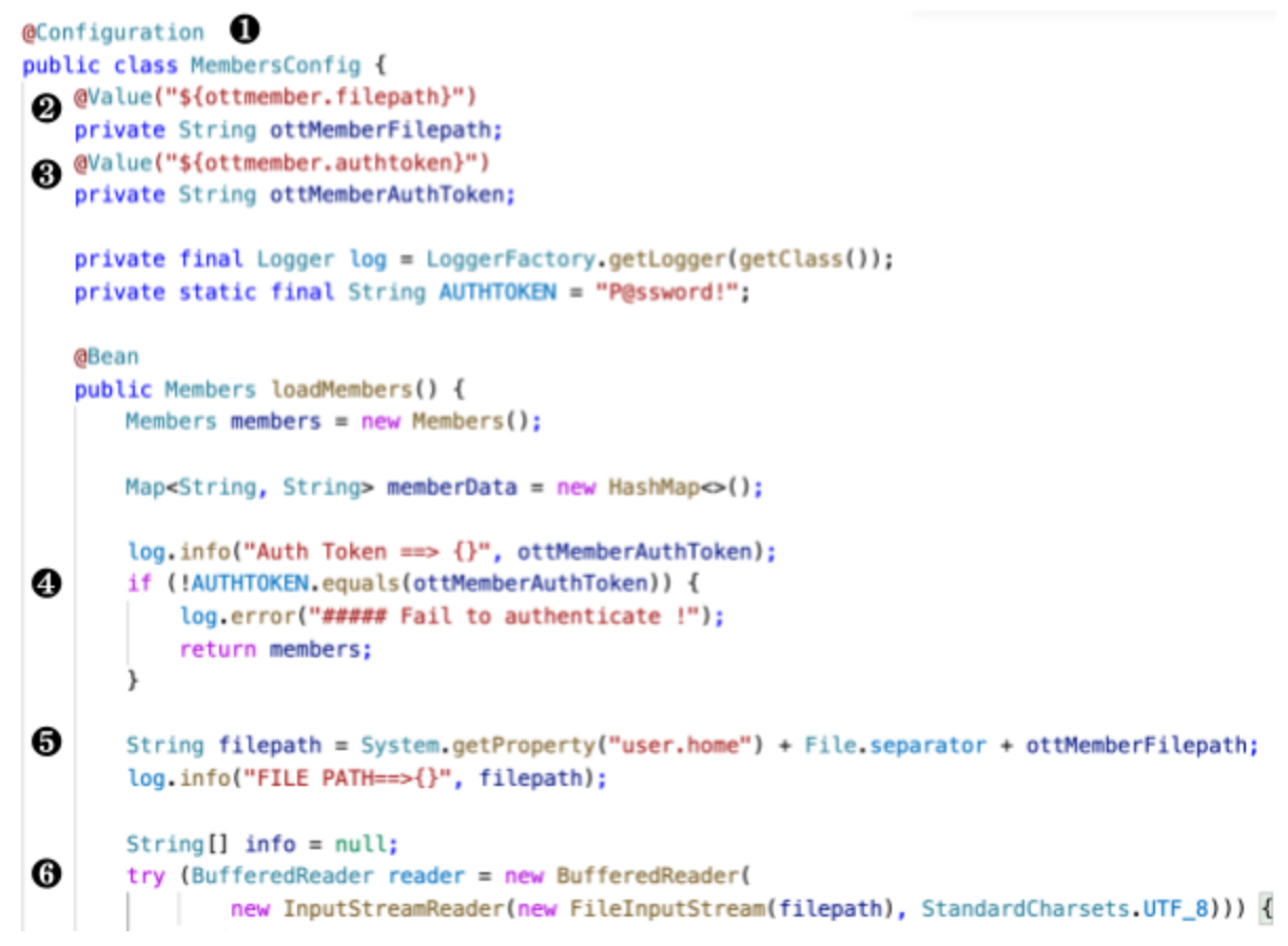 ‘MembersConfig’클래스는 ❶ 스프링 빈Bean으로 정의되어 있어 위 ‘Controller’클래스에서 @Autowired로 불러서 사용할 수 있습니다. ❷ ‘ottmember.filepath’라는 설정값에서 데이터가 있는 파일 경로를 얻고 ❸ ‘ottmember.authtoken’이라는 설정값에서 인증토큰을 얻습니다. ❹ 설정값에서 구한 인증 토큰 값이 맞는지 검사를 하고 ❺ 최종 데이터 파일의 경로를 구한 후 ❻ 그 파일을 열어 memberData 값을 채우게 됩니다.