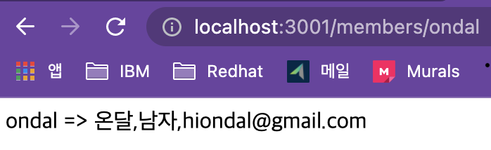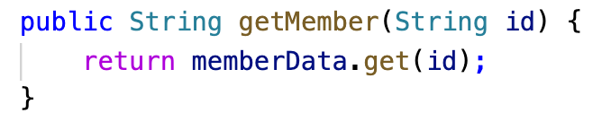 Class ‘Members’보시면 ‘getMember’ 메소드는 ‘memberData’라는 맵 객체에서 요청받은 id의 데이터를 리턴 합니다.