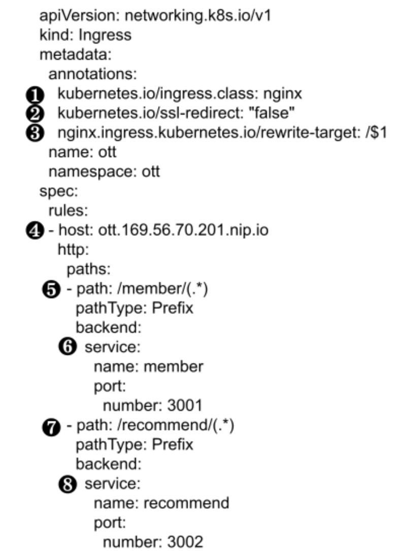 ❽ ‘/recommend/’로 시작하는 경로로 접근할 때 서비스 오브젝트 ‘recommend’를 ‘3002’번 포트로 연결 합니다. ‘3002’번 포트는 서비스 오브젝트가 수신하는 포트입니다. 서비스 오브젝트 ‘recommend’의 야믈에서 ‘spec.ports.port’값과 반드시 일치해야 합니다.
