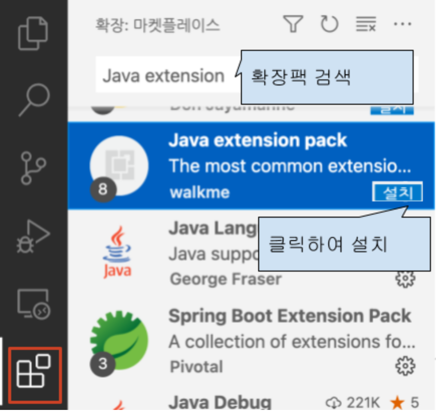 스프링부트 기반 개발을 위해 vscode에 아래 2개 확장팩을 설치 하십시오.