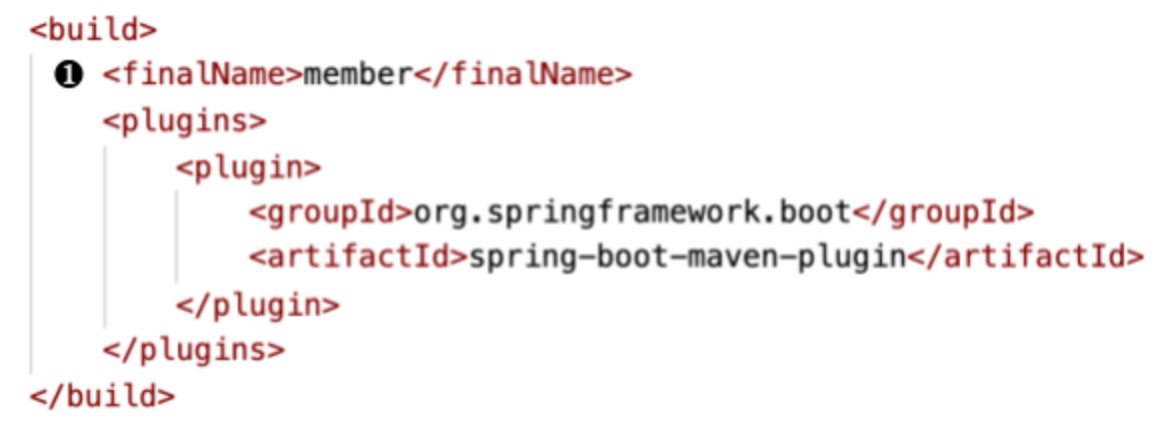 pom.xml을 보면 ❶ ‘finalName’으로 ‘member’라고 지정되어 있습니다. 실행 파일을 ‘member.jar’로 만들기 위한 설정입니다. 이 설정이 빠져 있으면 pom.xml의 ‘artifactId’와 ‘version’값을 참조하여 ‘member-0.0.1-SNAPSHOT.jar’로 만들어 집니다.