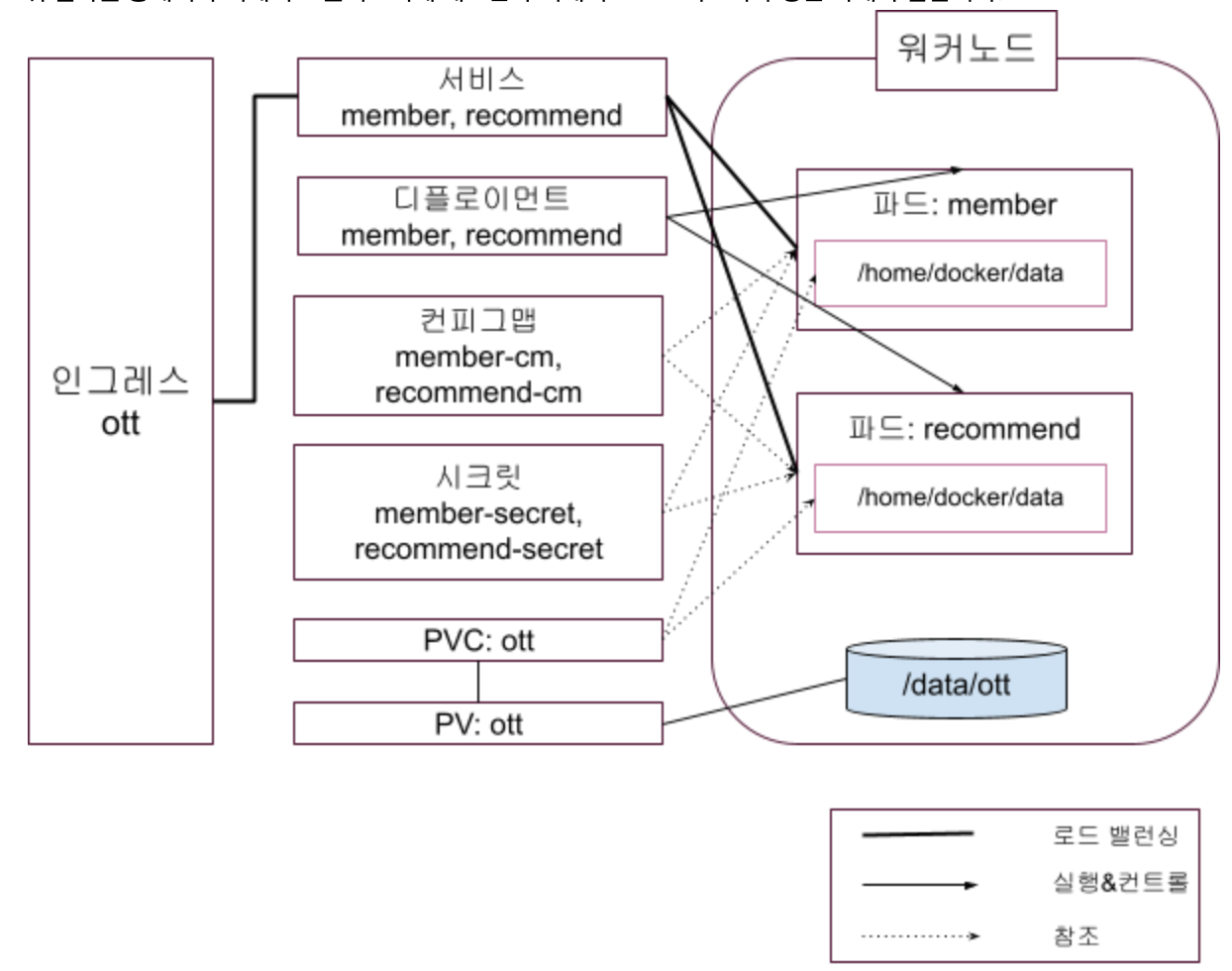 위 절차를 통해서 쿠버네티스 클러스터에 배포한 쿠버네티스 오브젝트의 구성은 아래와 같습니다.