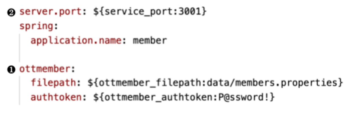 설정 ‘ottmember.filepath’과 ‘ottmember.authtoken’은 src > main > resources의 application.yaml의 ❶ 번과 같이 정의 되어 있습니다.