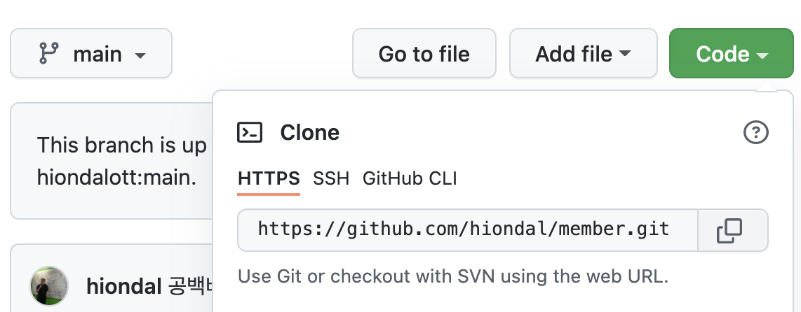 각 리포지토리 주소는 아래와 같이 리포지토리를 들어가 [Code]를 클릭하면 확인할 수 있습니다.