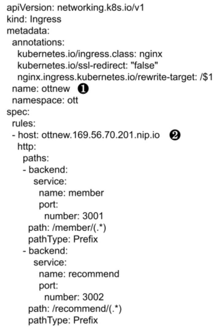 ❶ 오브젝트 이름은 ‘ottnew’로 하고 ❷ host 주소도 변경 합니다. 주소의 IP가 본인 클러스터의 컨트롤 플레인이나 워커 노드의 퍼블릭 IP인지 확인 합니다.