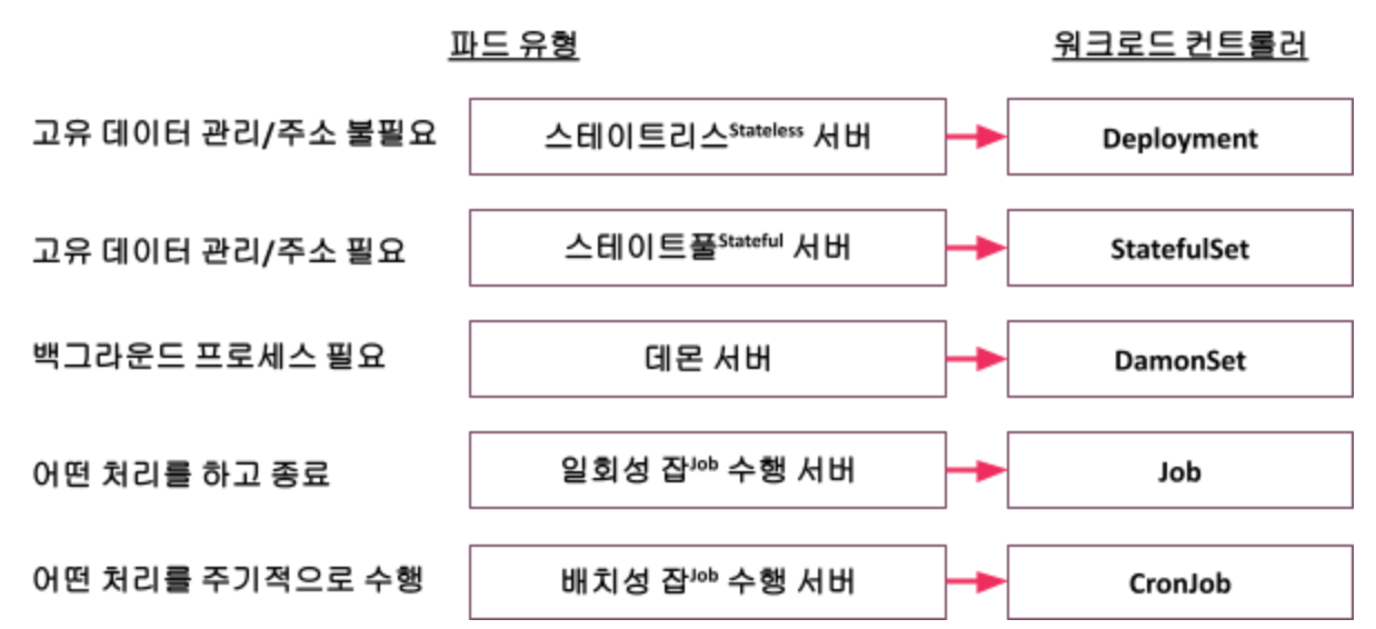 워크로드 컨트롤러는 파드의 유형에 따라 아래와 같이 5가지로 나눌 수 있습니다.