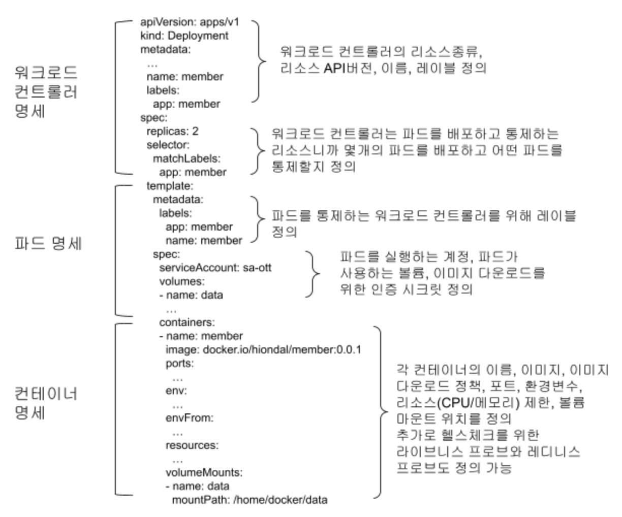 | 컨테이너 이미지 | image: {이미지 경로} | {레지스트리}/{오거니제이션}/{리포지토리}:{태그}형식으로 지정 |