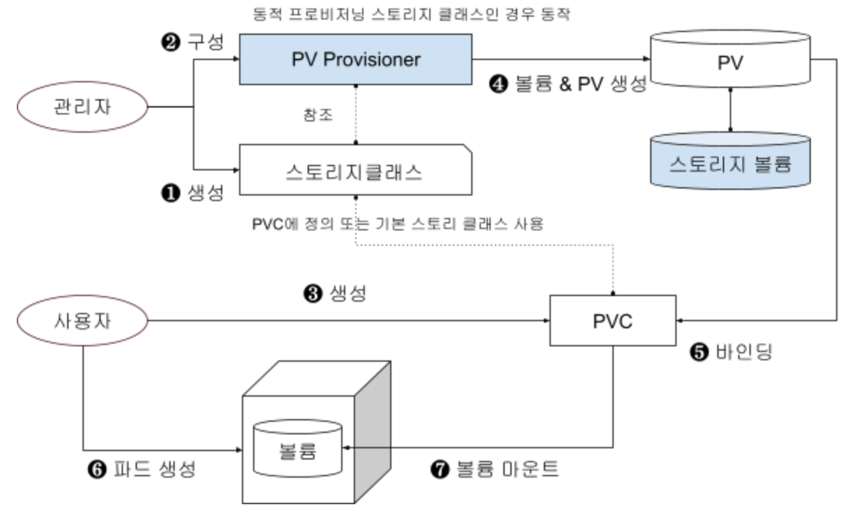 ❶ 프로비저닝: 퍼시스턴트 볼륨 오브젝트에 정의된 대로 물리적인 볼륨이 프로비저닝(공급)되는 단계입니다.