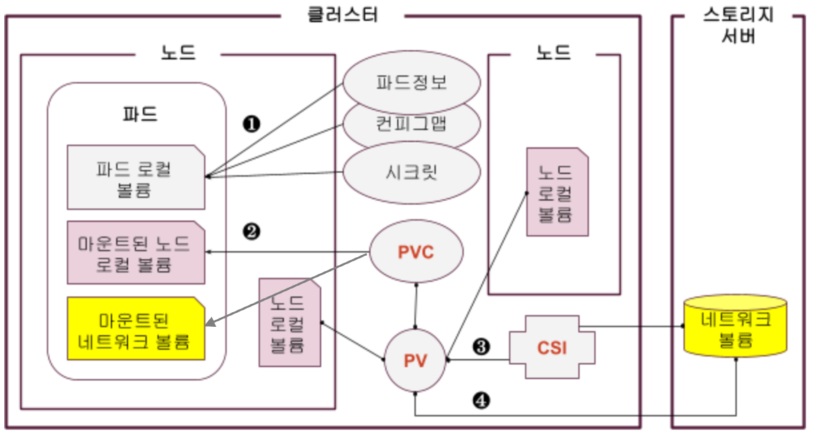 파드 로컬 볼륨은 파드 안에만 만들어지는 볼륨이고 노드 로컬 볼륨은 쿠버네티스 클러스터 노드의 볼륨이며 네트워크 볼륨은 클러스터 외부에 존재하는 볼륨입니다.