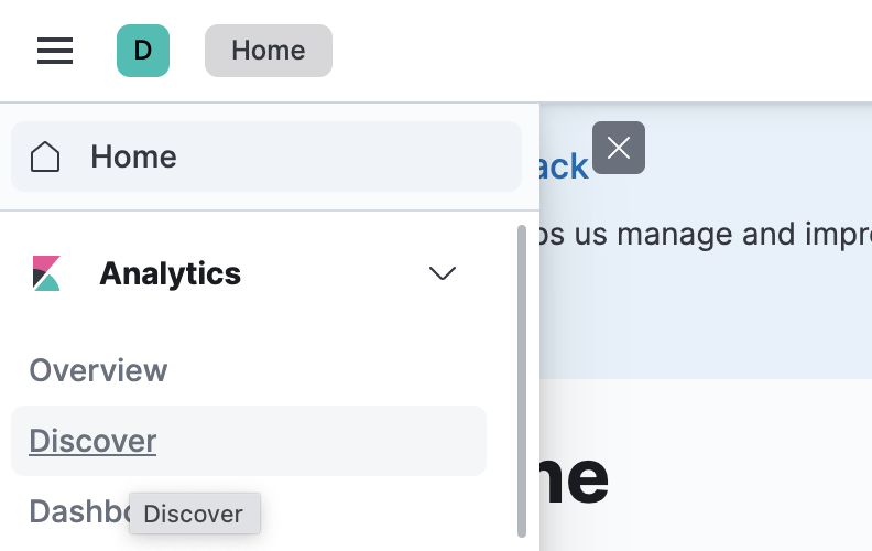 키바나의 좌측 상단 햄버거 메뉴를 누르고 ‘Discover’를 클릭 하십시오.